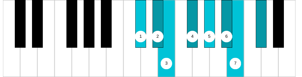 1, 2, ♭3, 4, 5, 6, ♭7